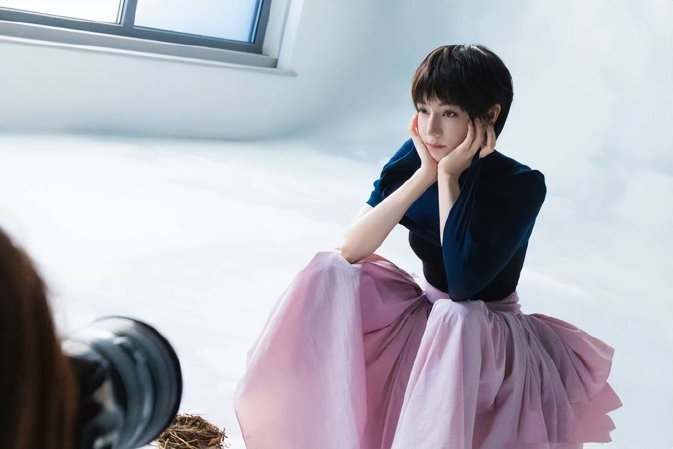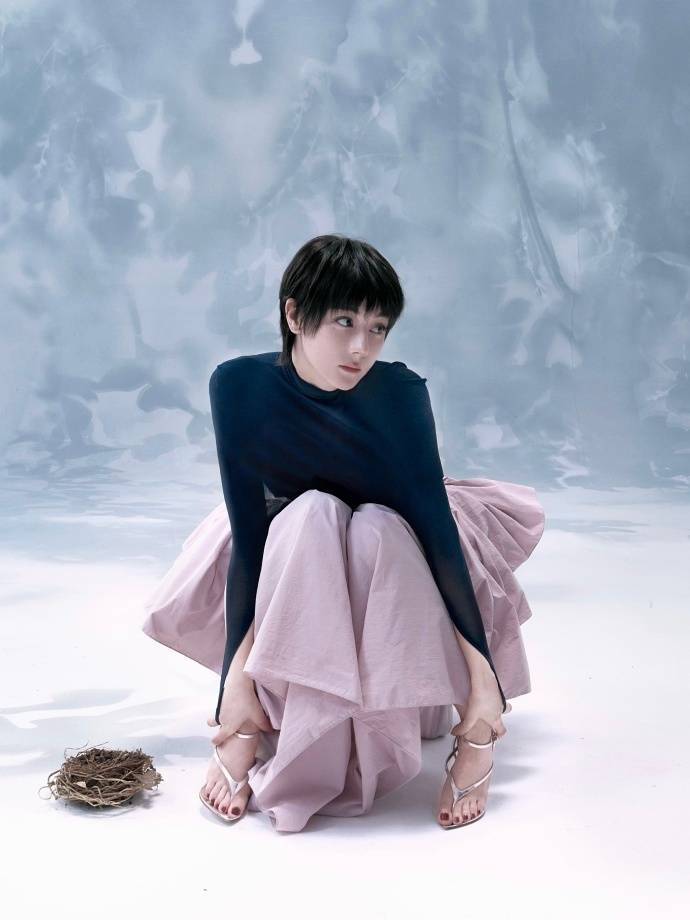 此次超短的发型堪称整套造型的灵魂,正所谓发型决定气质。利落的刘海 + 微卷发尾,既保留了少女感,又注入一丝酷飒的中性气质。在单品搭配上,上身的高领长袖上衣,修身但不紧绷,贴合身形却不压抑,体现“舒适即高级”的现代审美。下身的紫色长裙则颇具反差感,轻盈飘逸的材质,层叠的设计,仿若云朵落地,充满童话般的梦幻感。若说上半身是理性的,那么下半身则充满着浪漫。